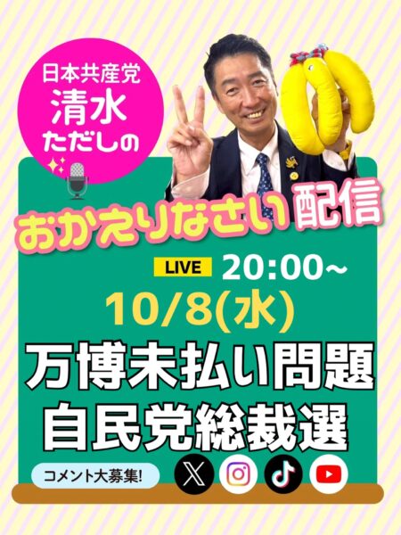 10/8(水)夜8時からX、YouTube、Instagram、TikTokからライブでお届けします📱