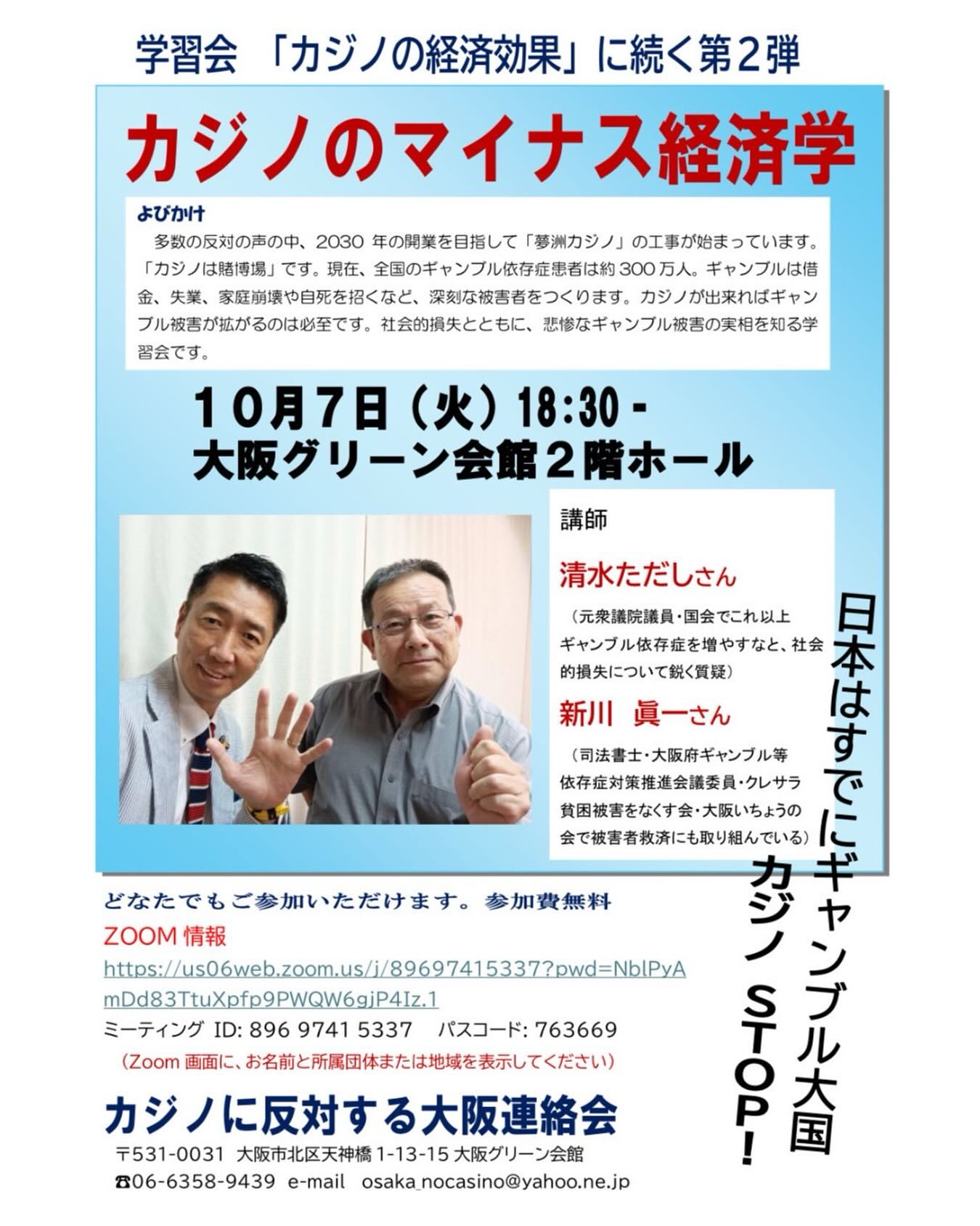 今夜18:30〜カジノに反対する大阪連絡会が主催する「カジノのマイナス経済学」と題した学習会が開催されます。私も韓国やシンガポールの例を紹介して、カジノがいかに国民生活やその国の経済に悪影響をもたらすかについて講演します。参加費無料、zoomでの参加もOKです。
