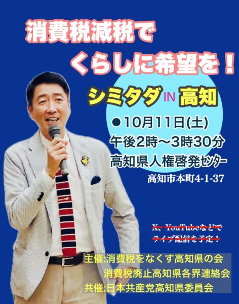 自公連立政権崩壊という激動の情勢のもと、明日は高知県にて消費税問題を中心とした学習会に参加します‼️なお、会場との関係でLive配信は見合わせることとなりました🙇‍♂️後日、YouTubeにアップするようにいたします▶️