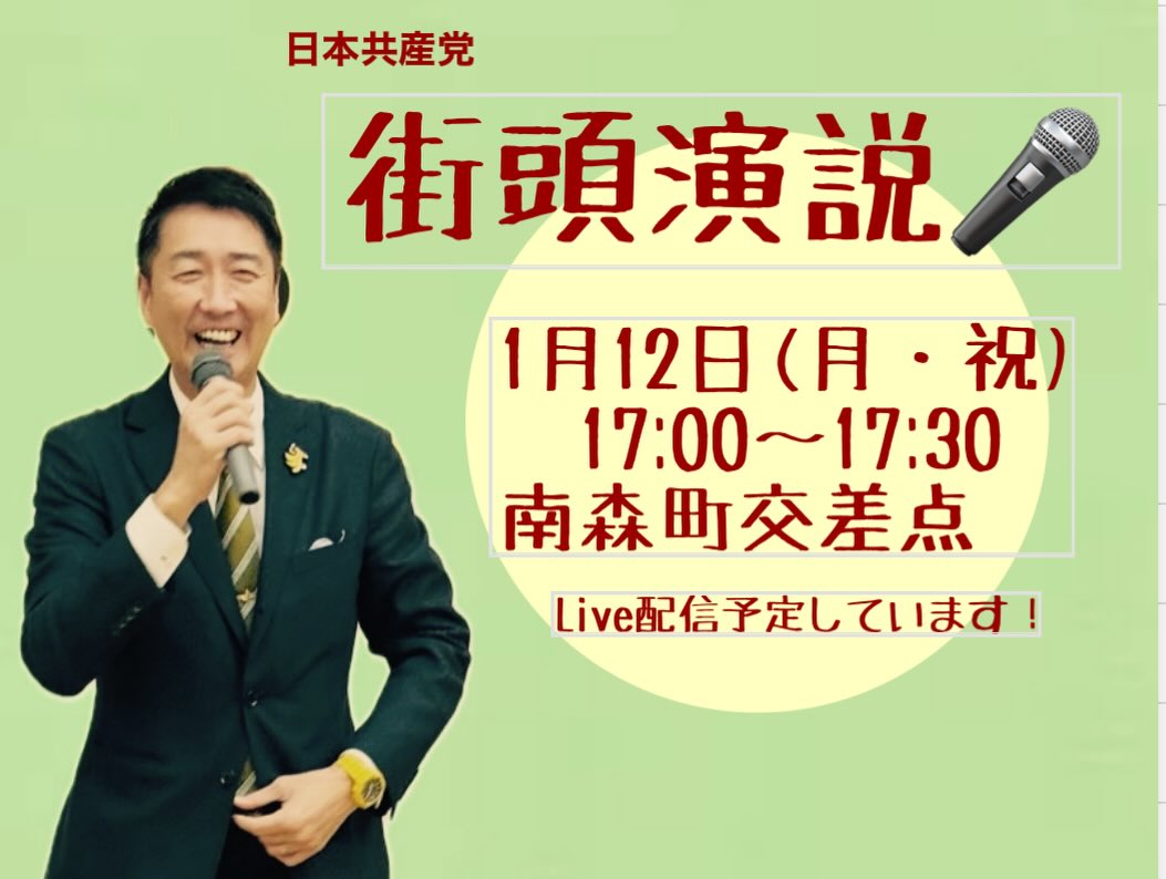 本日1/12の17:00から、南森町交差点で日本共産党の街頭演説を行ないます。清水ただしが今の政治情勢を語ります。XやYouTubeなどでLive配信することを予定しています。
