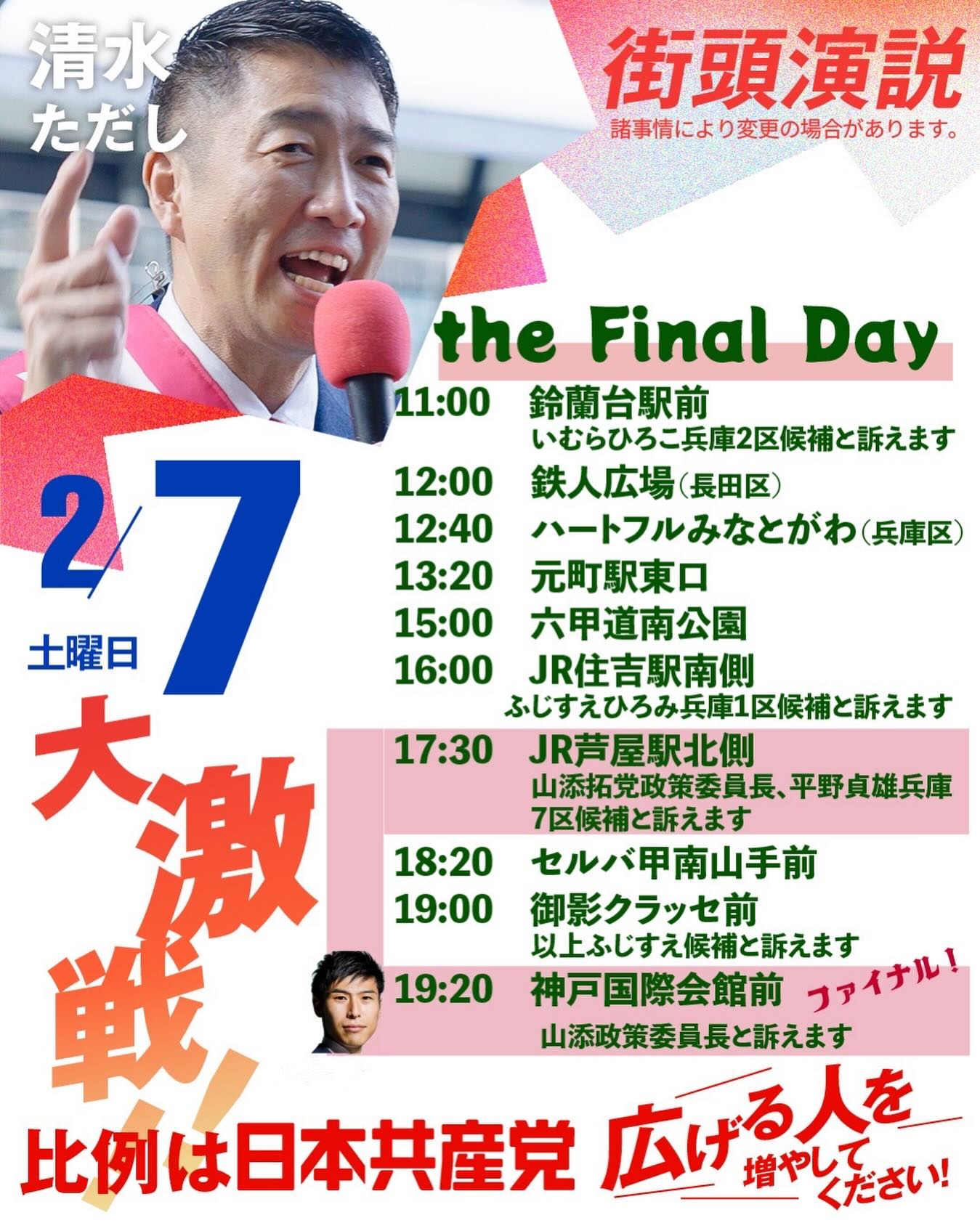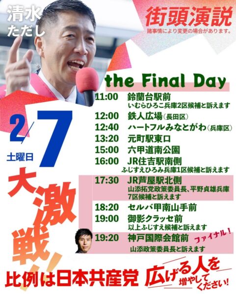 衆議院選挙最終日、2/7(土)の活動スケジュールです。