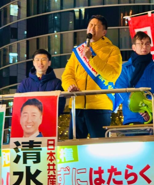 山添拓政策委員長・参院議員と一緒に最後まで比例代表で日本共産党を広げてくださいと訴えました。