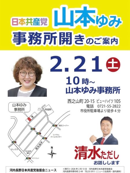 【ご案内】4月に行われる河内長野市議会議員選挙に立候補を予定している、山本ゆみさんの事務所開きが2/21(土)10時から行われます