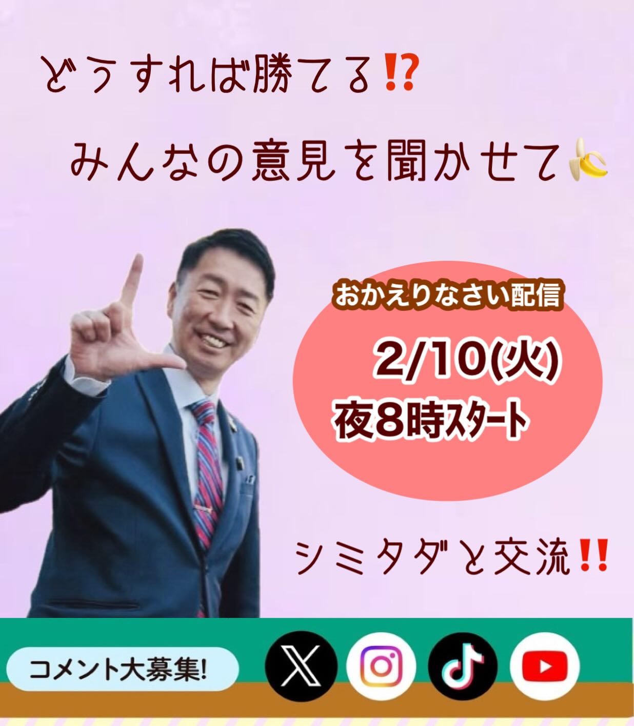 明日2/10(火)夜8時から、おかえりなさい配信をお届けします。