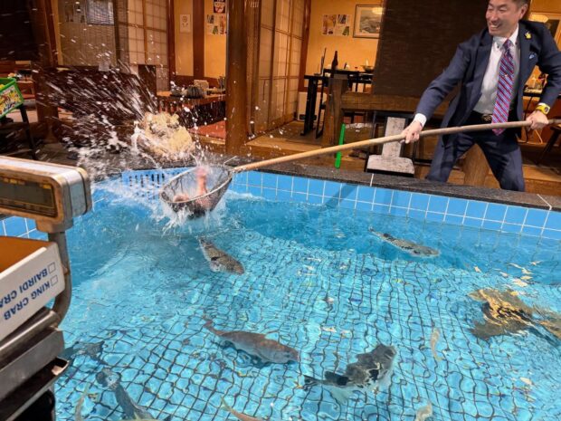 かなり苦戦しましたが、なんとか生簀の鯛を掬いあげることができました!都島民商の新年会にお伺いして会員のみなさんと交流!消費税減税とインボイス廃止へ頑張ります!