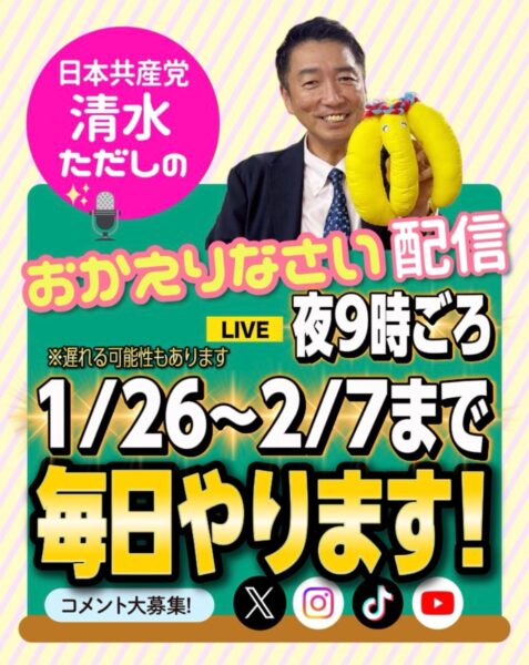 今日から2/7(土)まで【清水ただしのおかえりなさい配信】毎日やります!時間は夜9時頃を予定しています
