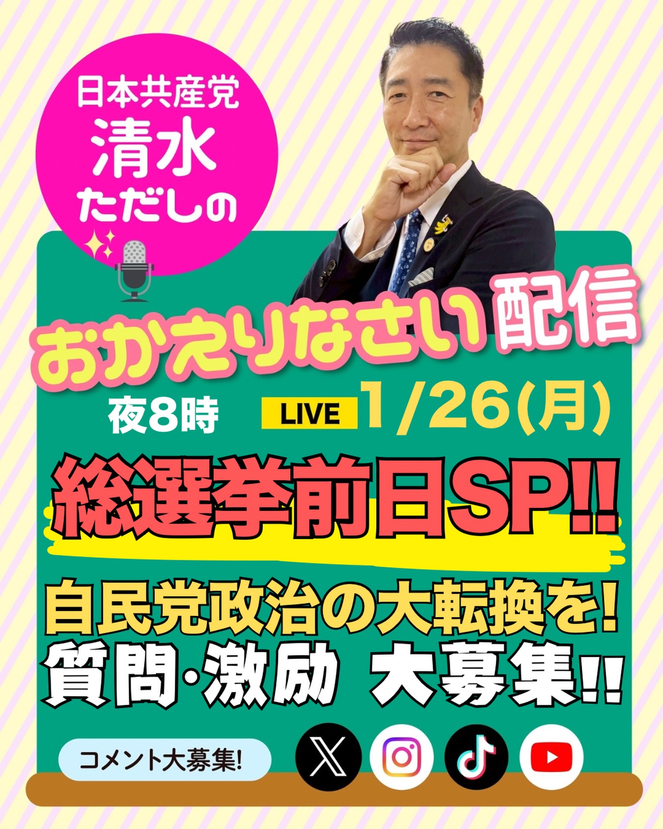 1/26(月)夜8時からおかえりなさい配信をお届けします!衆議院選挙の公示を翌日に控えたシミタダの思いを語ります!みなさんからのコメントにもできるだけお答えしたいと思いす!