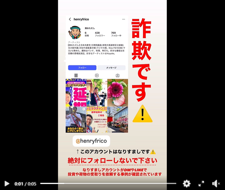 清水ただしの名を語ってDM(ダイレクトメッセージ)やLINEで投資の勧誘や荷物の受取りを指示する事例が確認されています。