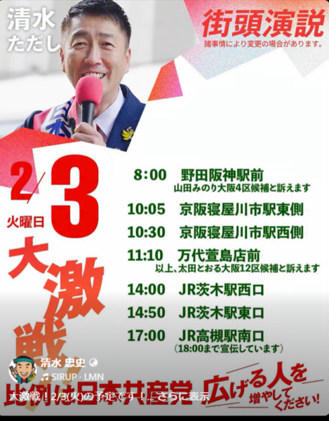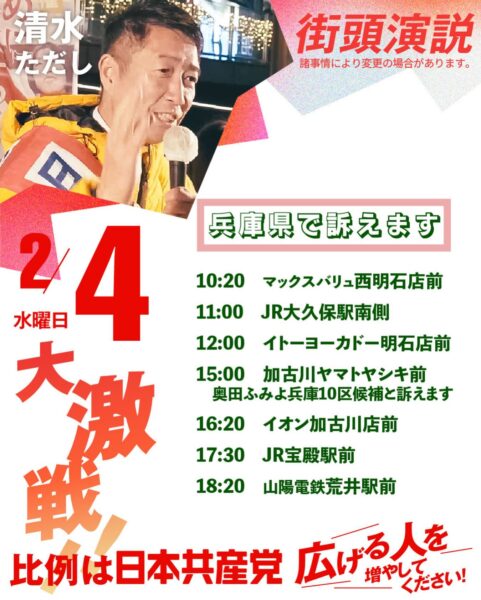 衆院選9日目、2/4(水)の活動スケジュールです。
